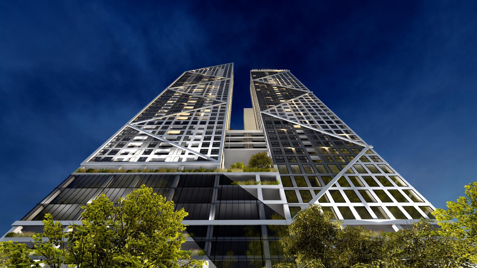 Khối đế tòa nhà gồm 10 tầng là khu dịch vụ và văn phòng, 8 tầng để xe, còn lại là khu căn hộ.