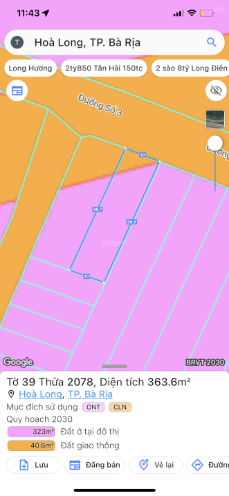 22x36m có 120m2 TC góc 2 mặt tiền, đường số 3 QL56, Hoà Long, Bà Rịa giá 9tỷ có bán lẻ từng lô
