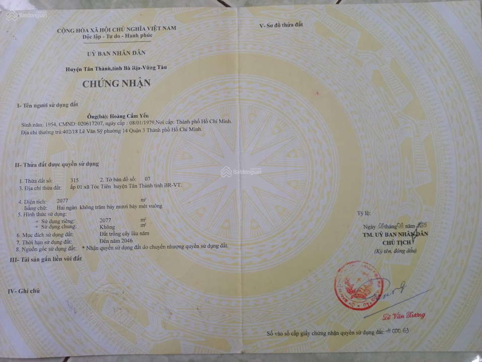 Thông tin khác: Bán 2 sào đất gần đường Phú Mỹ - Tóc Tiên, có 100m2 thổ cư, ô tô vào tận đất, 5tỷ có thương lượng.