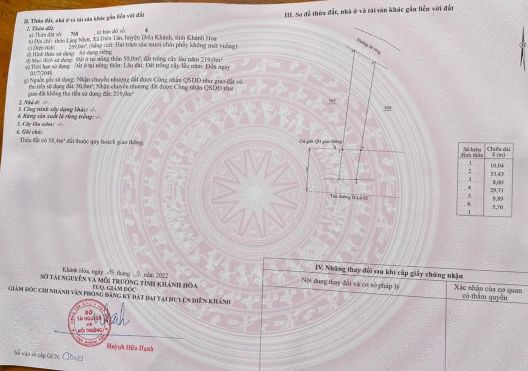 Bán Đất Hương Lộ 62 Diên Tân Diên kHánh Khánh Hòa