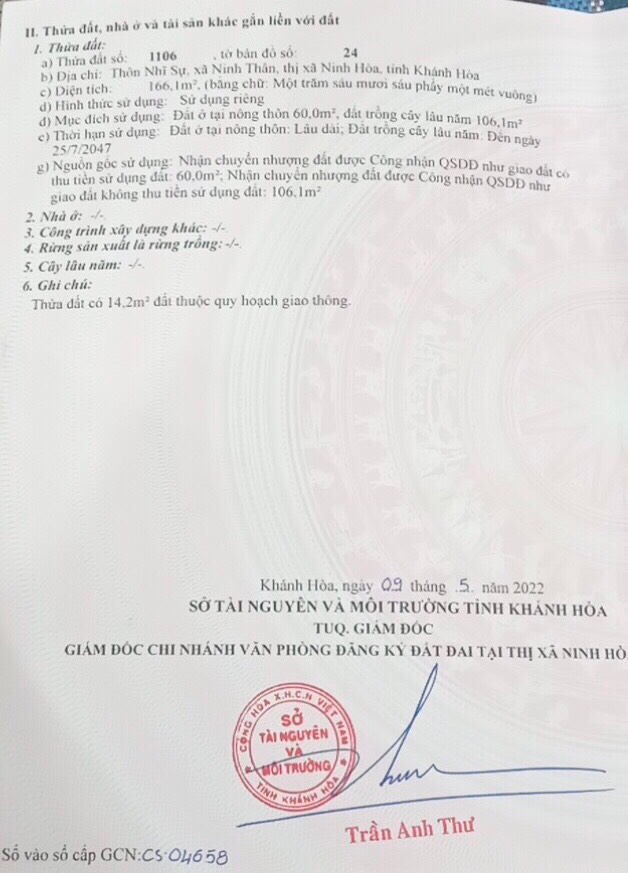 Thông tin khác: BÁN ĐẤT NINH THÂN-NINH HÒA DT 166 M2 CHÓ SẴN 60M2 THỔ CƯ GIÁ CHỈ 550TR