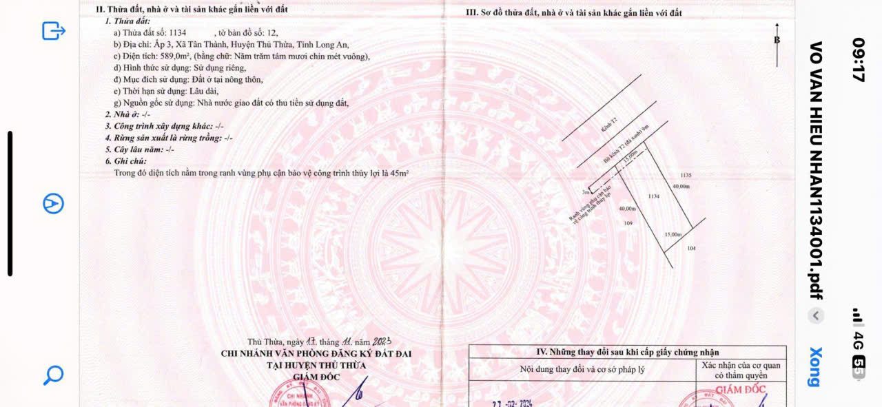 Thông tin khác: Bán đất thổ cư đường đá xanh 9m xã Tân Thành , Thủ Thừa dt 589m2 giá 2,15 tỷ