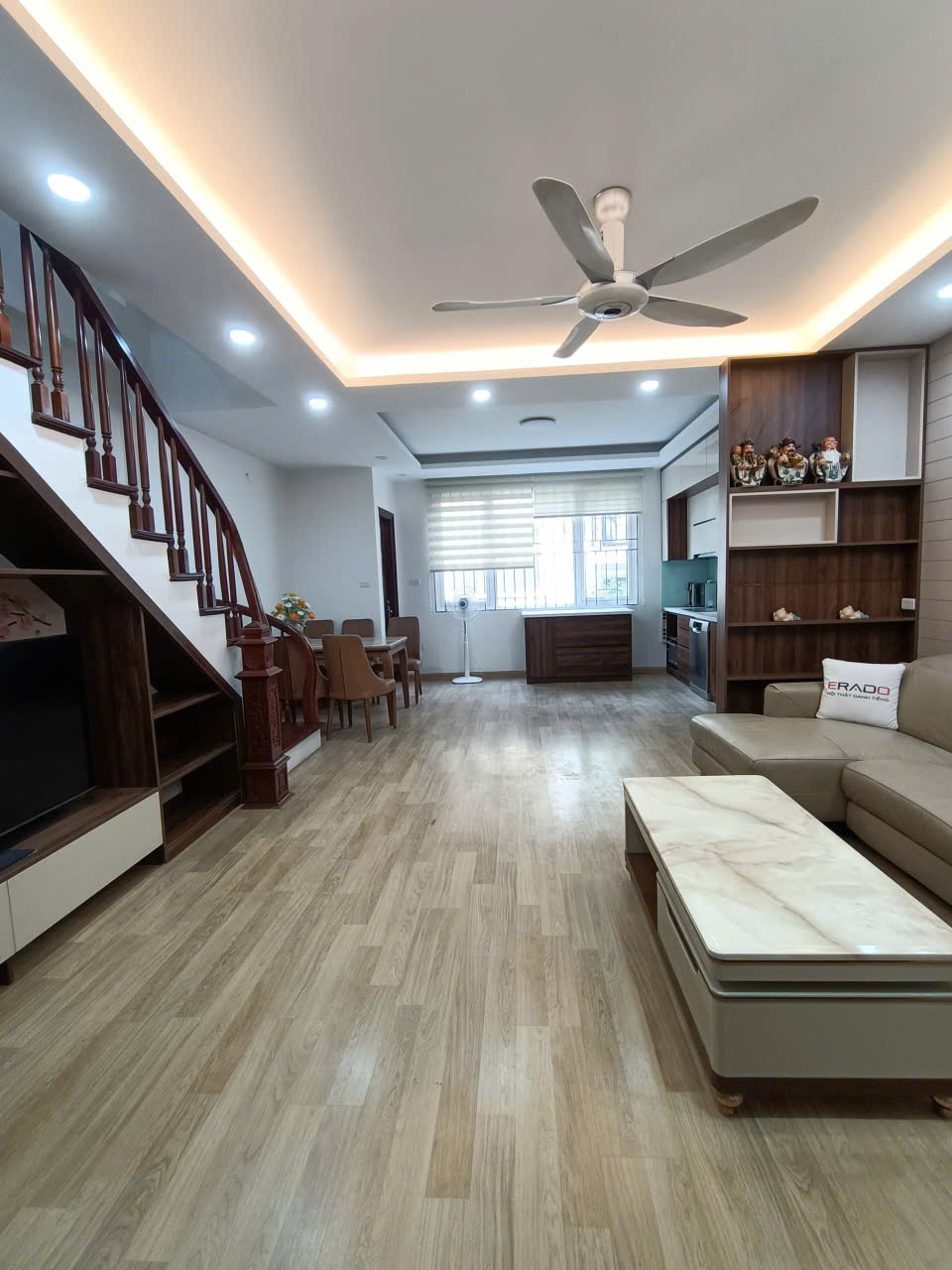 Tầng 4: Không gian sinh hoạt chung gồm phòng khách + Phòng bếp cũng đầy đủ nội thất từ sofa da, ti vi, tủ lạnh, bàn ăn, máy rửa bát…
