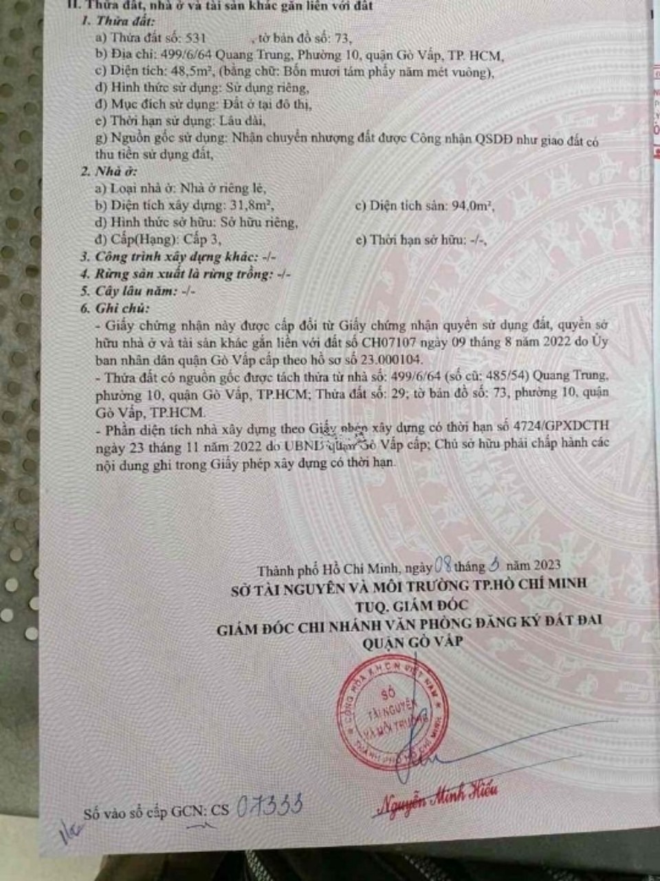 Thông tin khác: Bán nhà chính chủ 499/6/64 Quang Trung,phường 10, Gò Vấp -5,7 tỷ - 48.5 m2