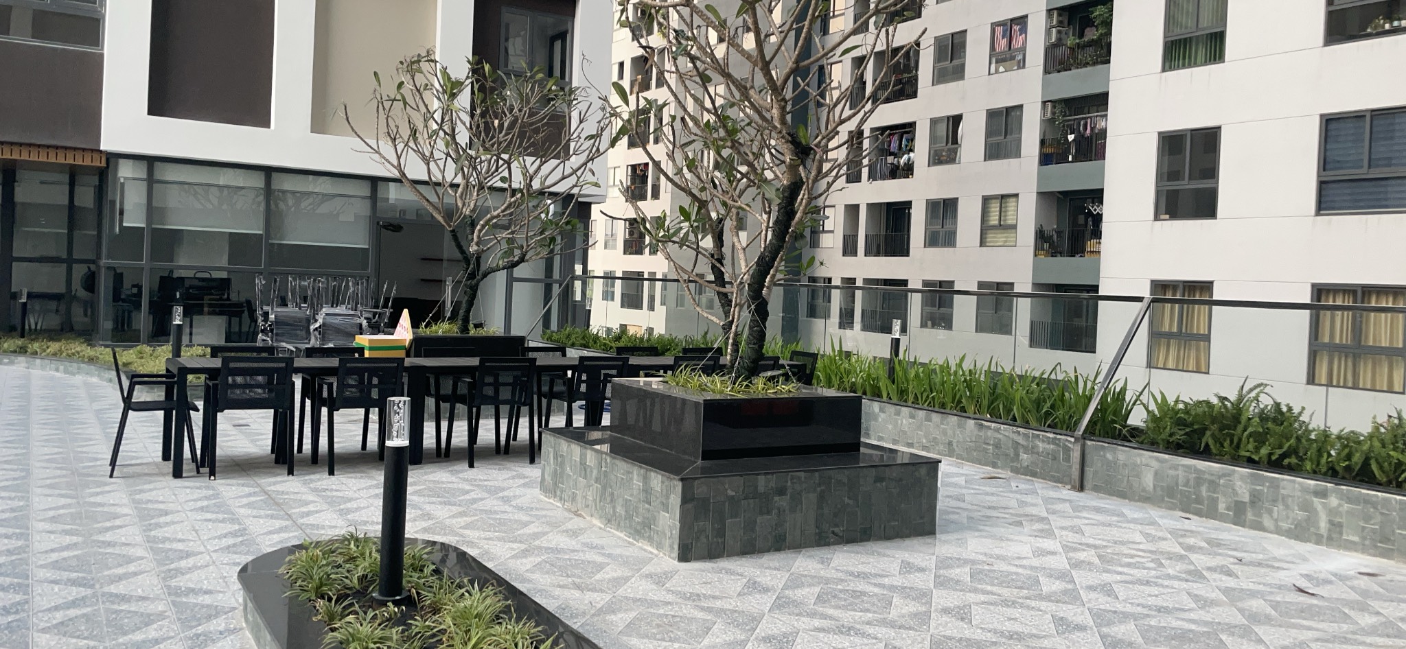 Tầng 1-2: khu thương mại – dịch vụ và tiện ích công cộng: trường mầm non, cà phê, hồ bơi, gym, bbq, ..