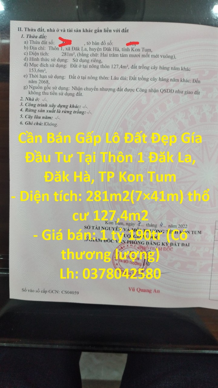 Thông tin khác: Cần Bán Gấp Lô Đất Đẹp Gía Đầu Tư Tại Thôn 1 Đăk La, Đăk Hà, TP Kon Tum