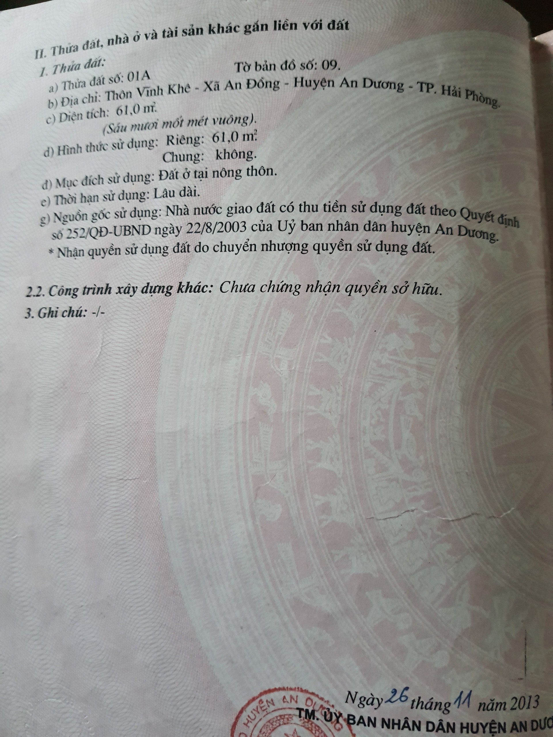 CẦN TIỀN BÁN GẤP LÔ ĐẤT ĐẸP, THÔN VĨNH KHÊ, HUYỆN AN DƯƠNG, HẢI PHÒNG