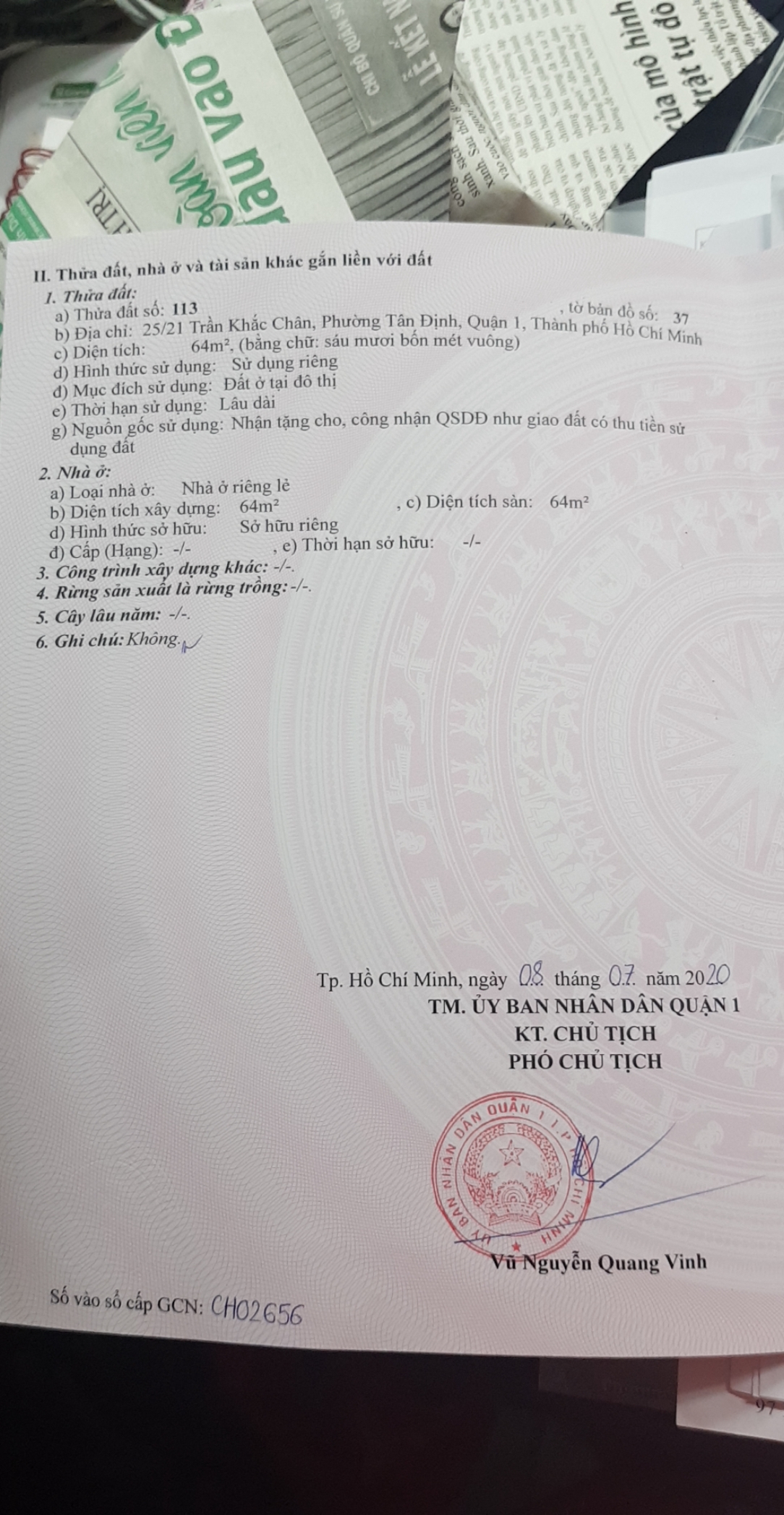 Thông tin khác: Chính chủ cần bán gấp nhà 1 trệt 1 lầu đường Trần Khắc Chân, Quận 1