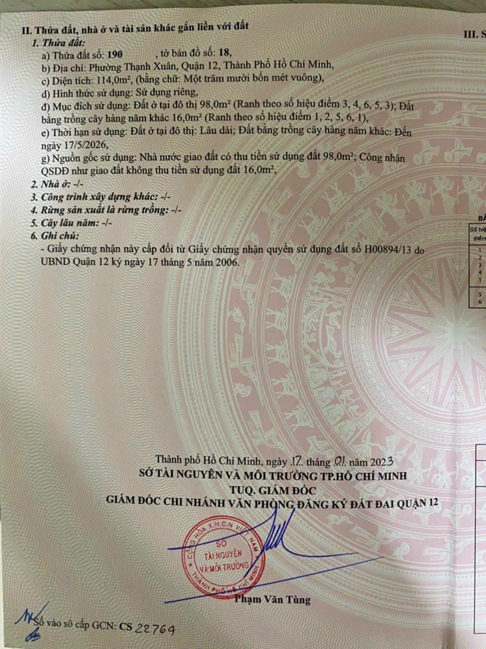 Thông tin khác: Đất đẹp 6x23m hẻm xe tải, gần full thổ cư, xây biệt thự, kho xưởng.