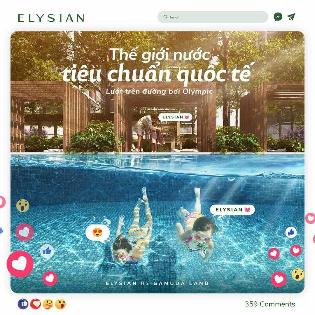 Hệ thống tiện ích dưới nước trong nội khu Elysian là một trong những dấu ấn nổi bật nhất với cụm hồ bơi đạt tiêu chuẩn Olympic sở hữu đường bơi dài 50m, bể jacuzzi, bể gia đình, và thác nước màn mưa với tổng diện tích mặt nước 1190m2.