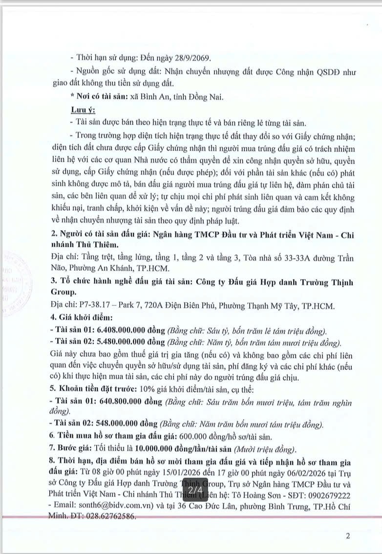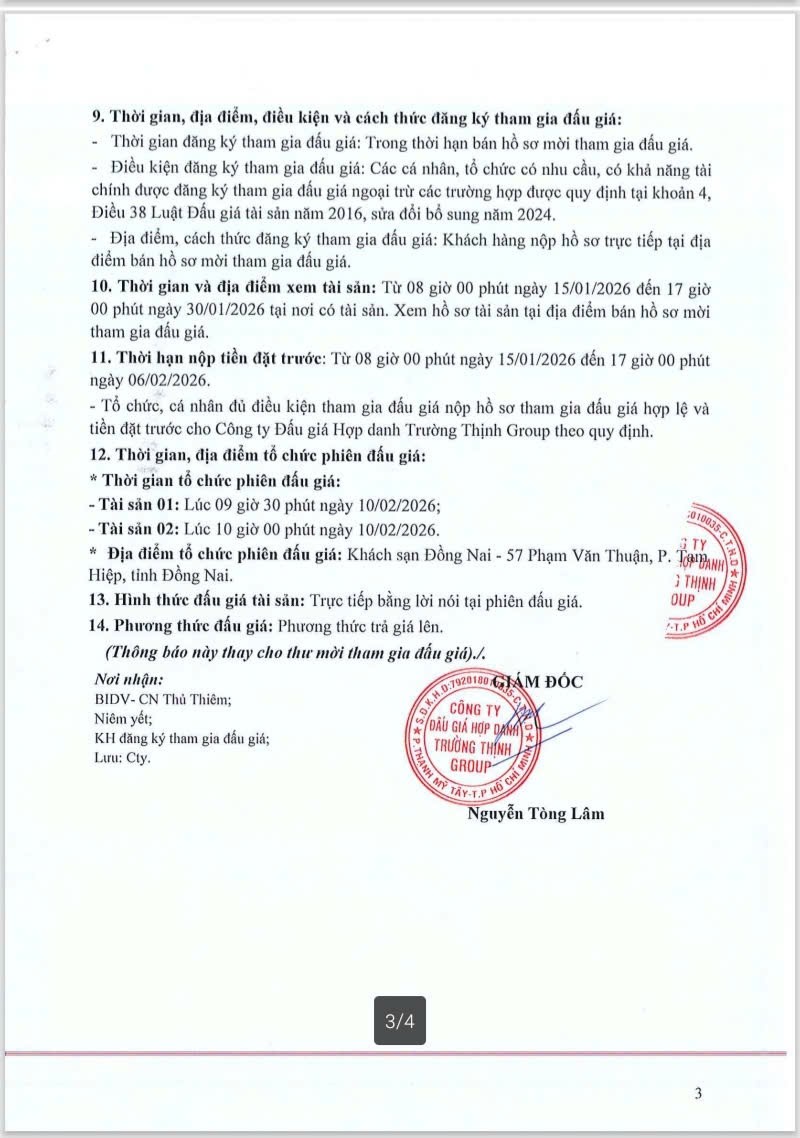 Thông tin chi tiết theo Thông báo đấu giá tài sản số 09-30/2024/TBĐGTS-TT ngày 14/01/2026 của Công ty Đấu giá Hợp danh Trường Thịnh Group.
