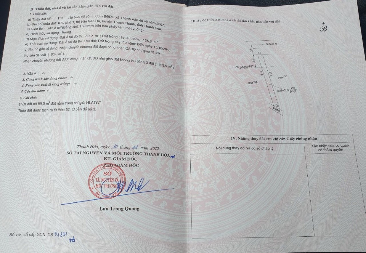 Thông tin khác: QL45 TT Vân Du, 5x50, hơn 600trđường rộng 42m , đất ODT, gần khu du lịch Thác Voi