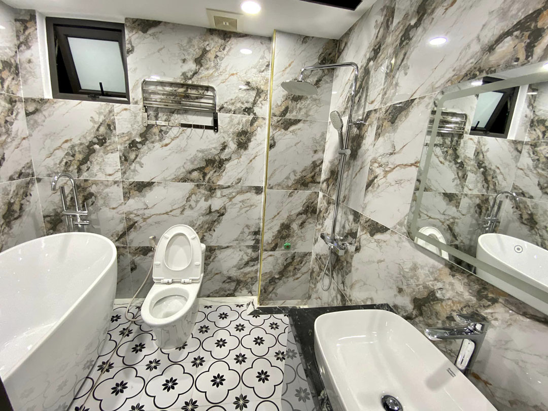 – Nhà 7 tầng, thang máy, gara 2 ô tô, chất lượng cao cấp, kiến trúc đẹp, hiện đại, sang trọng. Nội thất gỗ óc chó, cầu thang ốp đá marble, sàn gỗ xương cá, hệ thống điều hoà âm trần, thiết bị điện Panasonic, thiết bị wc Inax, …Thiết kế công năng sử dụng hợp lý phù hợp gia đình ở và kinh doanh: Tầng 1 gara ô tô, kinh doanh, wc. Tầng 2 thông phòng kinh doanh. Tầng 3,4,5 mỗi tầng 01 phòng ngủ, wc khép kín. Tầng 6 phòng khách, bếp. Tầng 7 phòng thờ, sân thượng. Tum phòng kỹ thuật