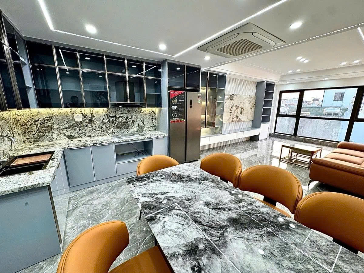 Tầng 6: Phòng khách + bếp ăn thiết kế mở, hiện đại, tràn ngập ánh sáng.